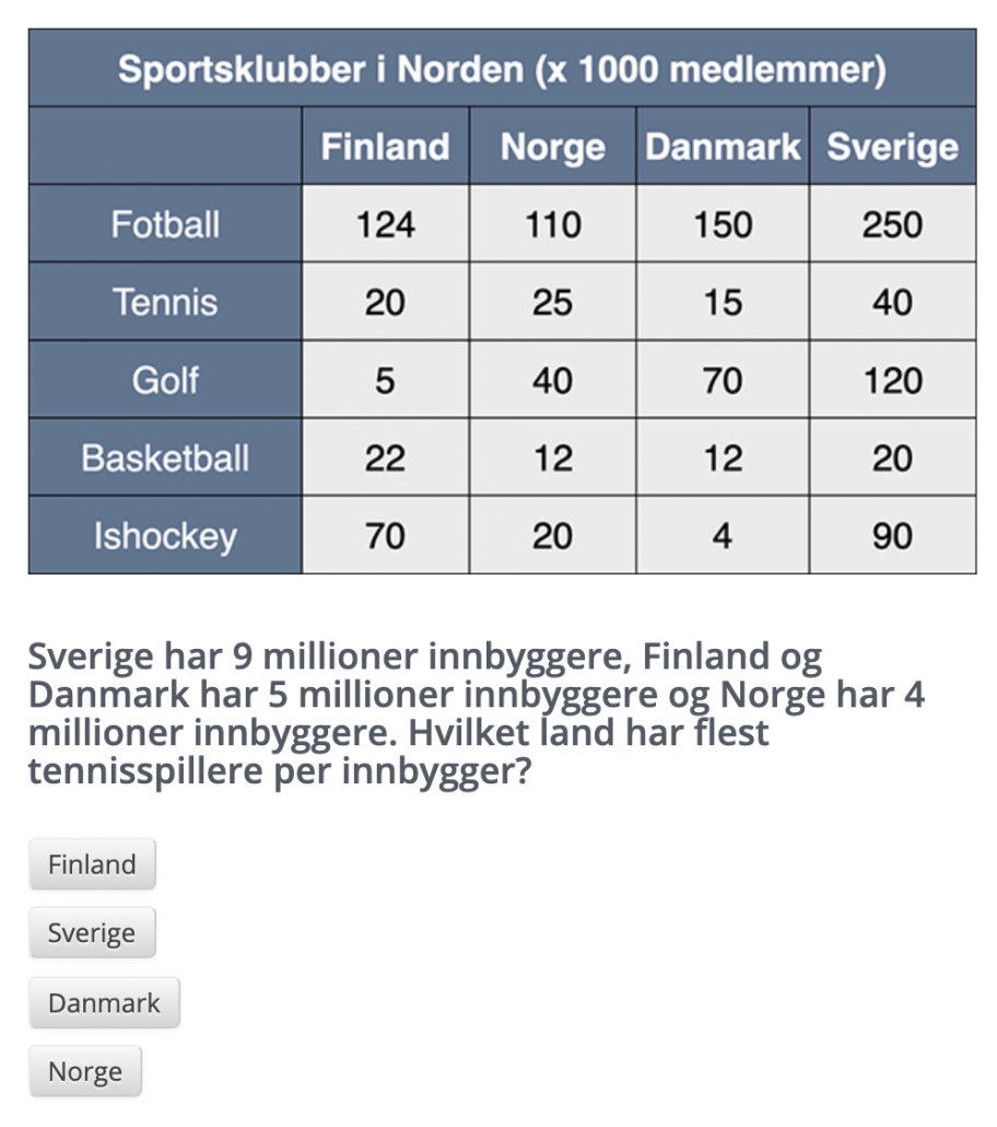 Deretter får du tre spørsmål med stigende vanskelighetsgrad som du skal svare på ut ifra tabellen eller grafen.
