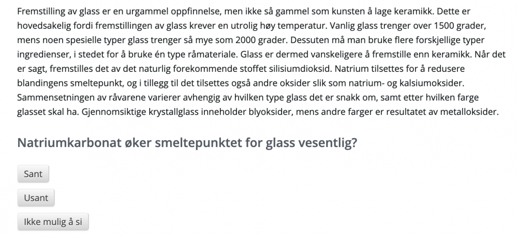 Deretter får du tre spørsmål med økende vanskelighetsgrad som du skal svare på ut ifra teksten.